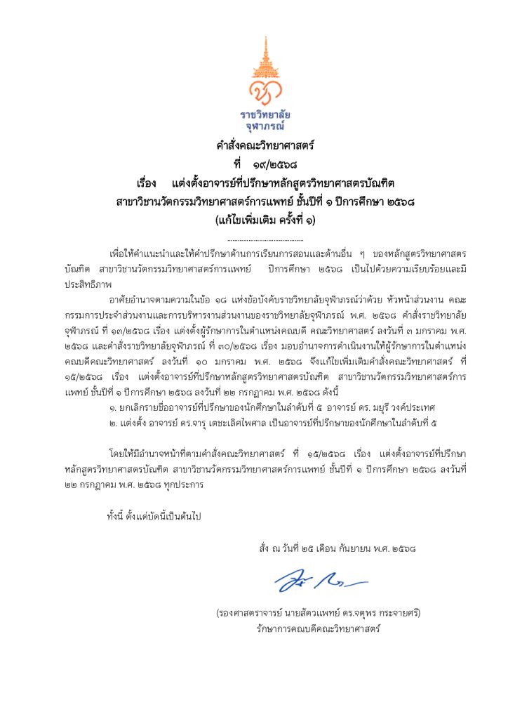 คำสั่งคณะวิทยาศาสตร์ที่ 19/2568 เรื่อง แต่งตั้งอาจารย์ที่ปรึกษาหลักสูตรวิทยาศาสตรบัณฑิต สาขานวัตกรรมวิทยาศาสตร์การแพทย์ ชั้นปีที่ 1 ปีการศึกษา 2568 (แก้ไขเพิ่มเติม ครั้งที่ 1)