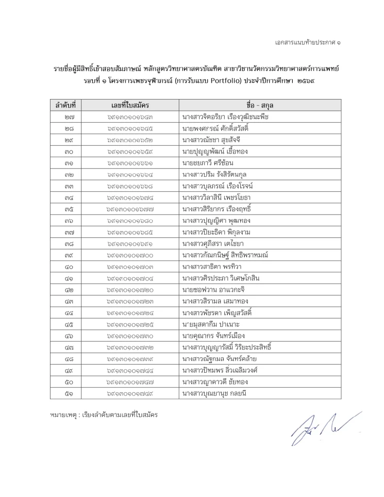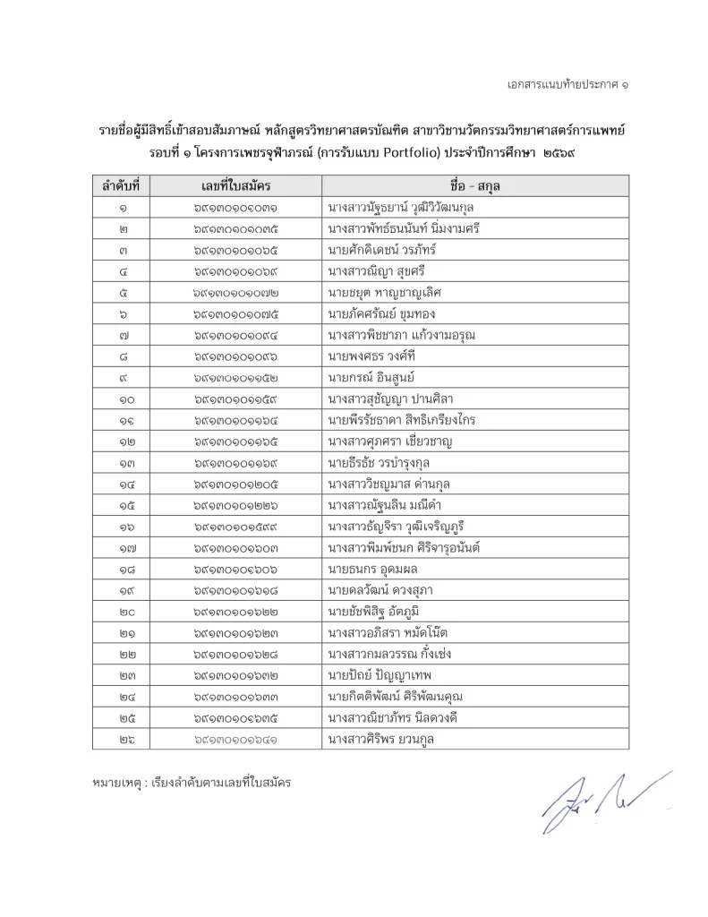 ประกาศ รายชื่อผู้มีสิทธิ์เข้าสอบสัมภาษณ์ หลักสูตรวิทยาศาสตรบัณฑิต สาขาวิชานวัตกรรมวิทยาศาสตร์การเเพทย์