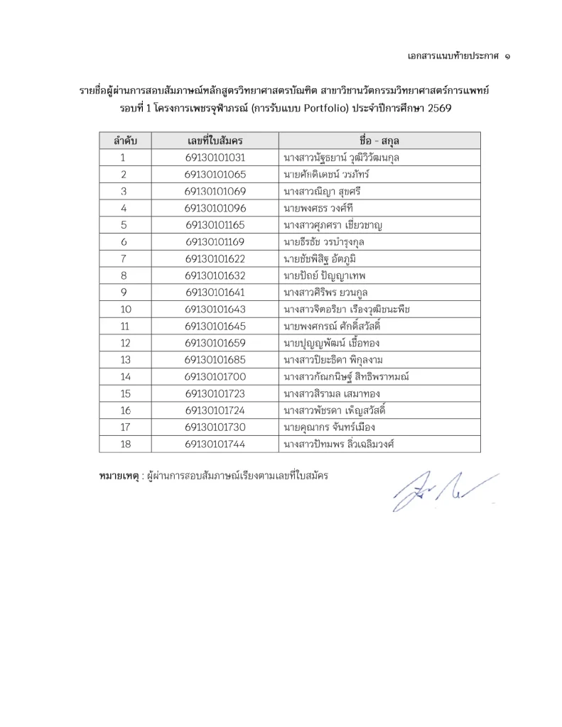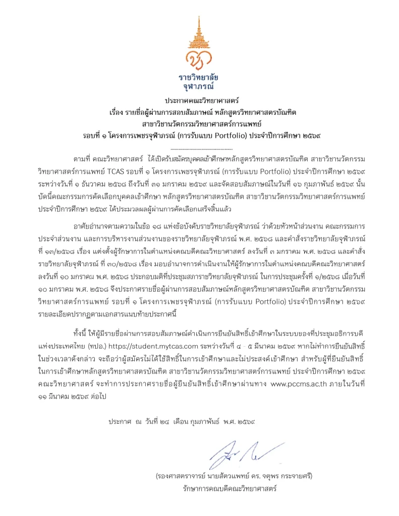 ประกาศคณะวิทยาศาสตร์ เรื่อง รายชื่อผู้มีสิทธิ์เข้าศึกษาหลักสูตรวิทยาศาสตรบัณฑิต สาขาวิชานวัตกรรมวิทยาศาสตร์การแพทย์ TCAS รอบที่ 1 โครงการเพชรจุฬาภรณ์ (การรับด้วย Portfolio) ประจำปีการศึกษา 2569